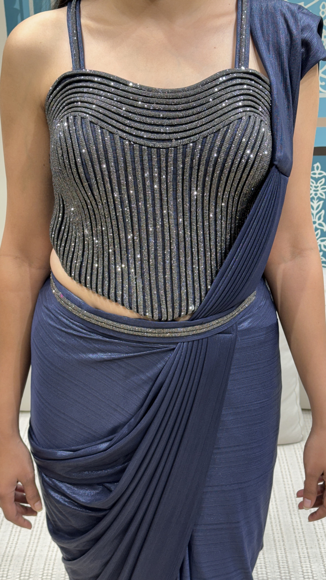 This glamorous ready-to-wear saree comes in a rich midnight navy tone with a soft sheen that gives a luxe finish. The pre-draped silhouette features elegant pleats and a sleek fall, making it effortless to wear while still looking perfectly styled. It is paired with a statement glitter corset-style blouse designed with shimmering vertical embellishment lines that create a flattering, structured fit. Finished with subtle waist detailing and a modern pallu placement, this look is ideal for cocktail nights, receptions, birthday parties, and evening celebrations where you want an elegant sparkle with zero effort.