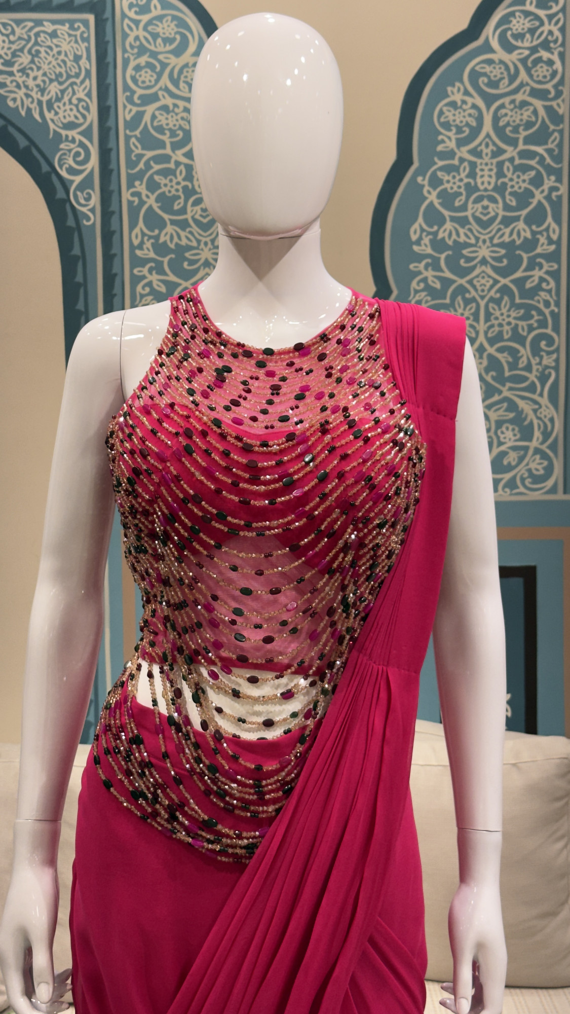 This hot pink ready-to-wear saree features a dramatic beaded blouse with cascading embellishments and a sleek, flowy drape. Designed for effortless glamour, it’s an ideal pick for parties, receptions, and evening celebrations. ?