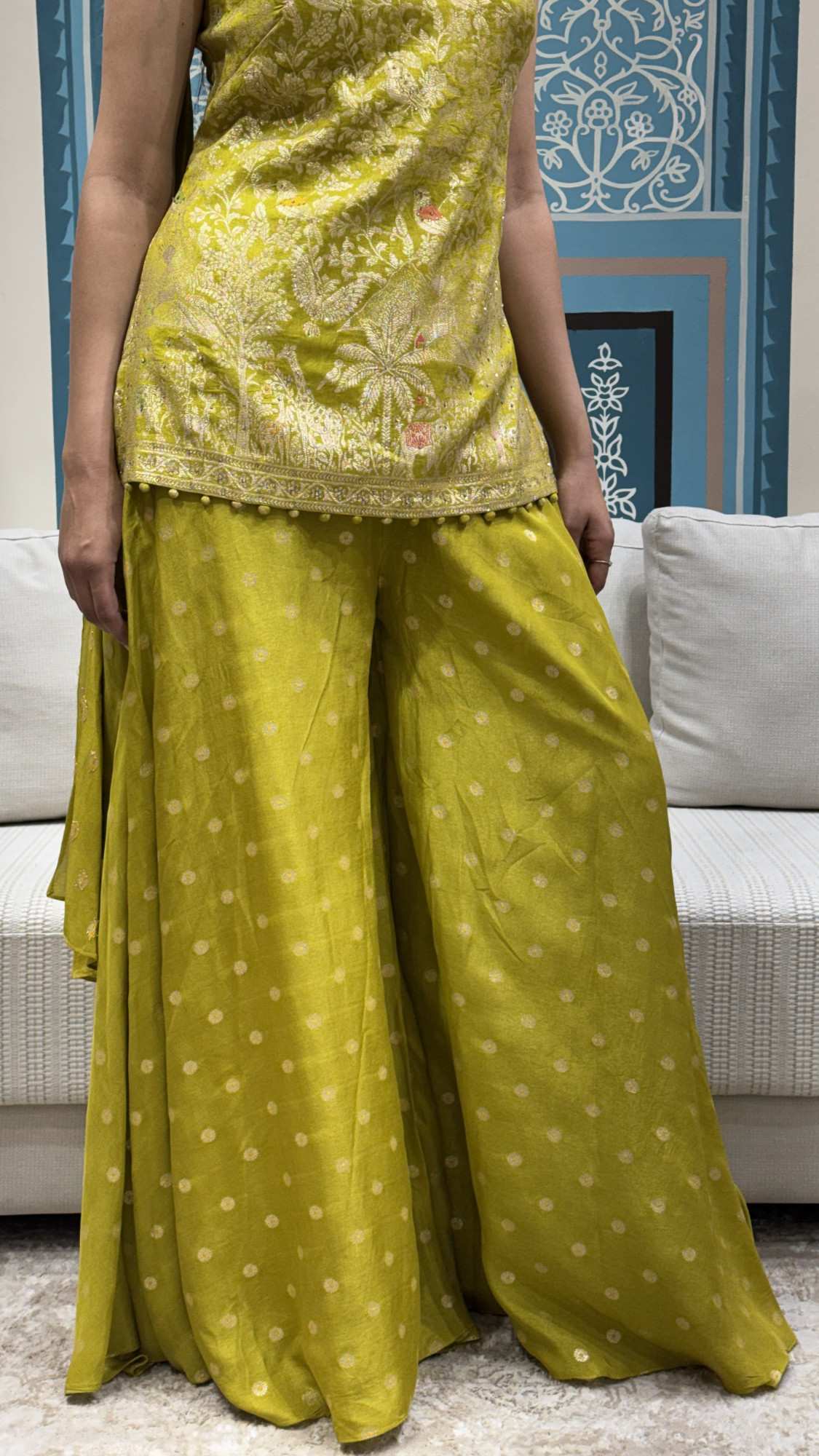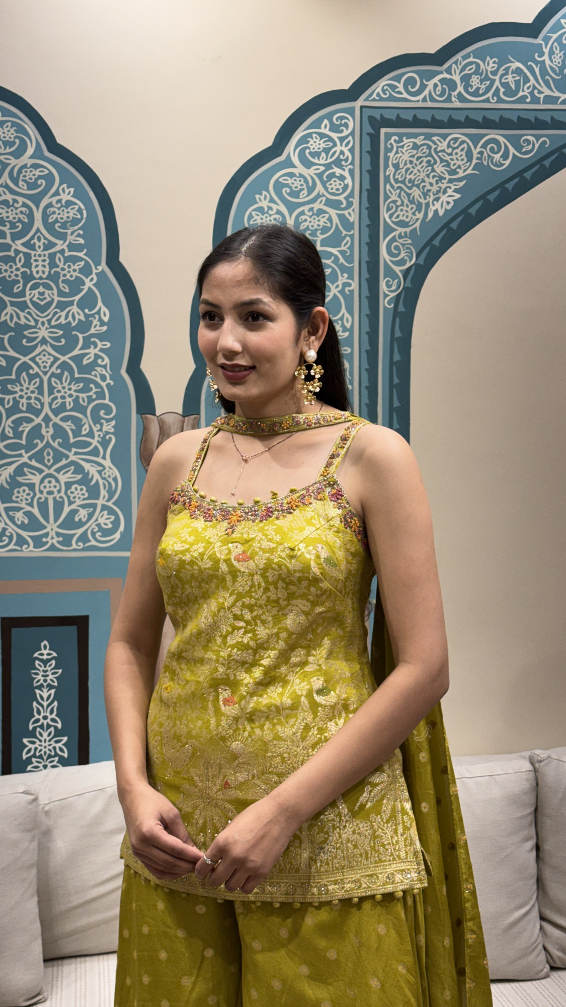 This crop top and palazzo set is crafted in a striking lime-green shade, highlighted with intricate brocade weaving and subtle floral motifs. The sleeveless crop top features delicate embroidered straps and neckline detailing, paired with flowy palazzo pants adorned with fine dotted patterns. Finished with a lightweight matching dupatta, this ensemble is perfect for festive occasions, mehendi functions, and daytime celebrations. ✨
